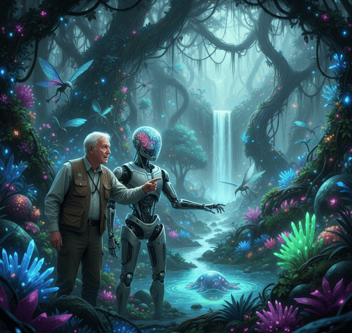 Image Prompt: "David Attenborough and AI exploring uncharted ecosystems."