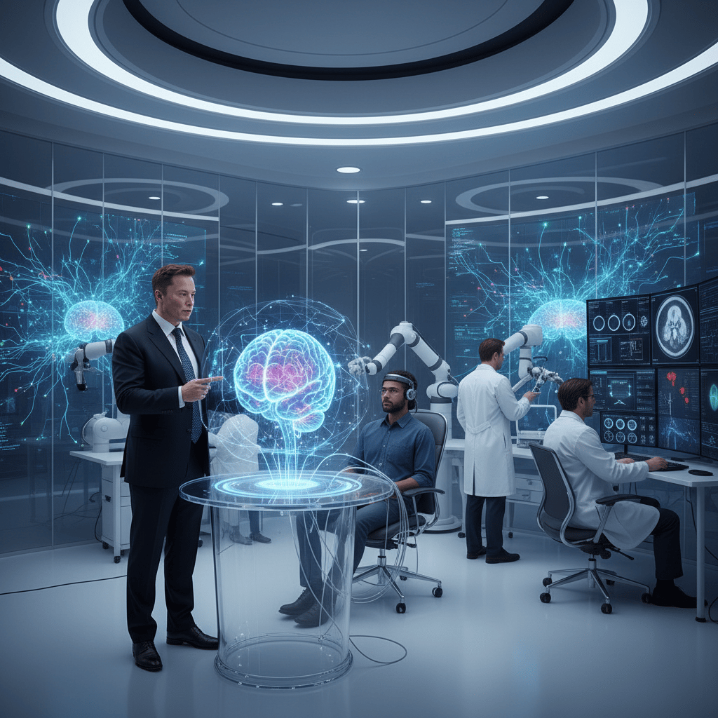 Prompt: Visualize a cutting-edge neuroscience lab where Elon Musk demonstrates advanced brain-computer interfaces. The space features glowing neural network visualizations, holographic brain scans, and AI systems mapping neural pathways. Scientists work with advanced medical technology, while screens display real-time brain activity. The environment is sterile yet futuristic, with blue and white lighting creating a sense of scientific breakthrough.