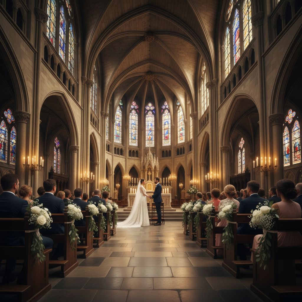 Prompt: A romantic wedding ceremony inside a grand church, with high arched ceilings, stained glass windows casting colorful light, and rows of wooden pews decorated with white flowers and greenery. The bride and groom stand at the altar holding hands, soft candlelight glowing around them. Guests seated quietly, a warm, sacred atmosphere filled with love and celebration. Cinematic composition, soft natural lighting, realistic details, timeless and elegant mood, high resolution.