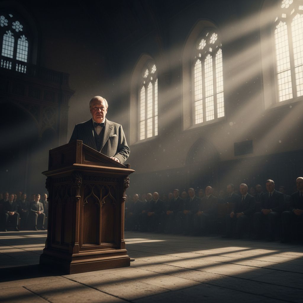 Prompt: Ultra-realistic cinematic image of Winston Churchill standing at a grand podium in a dimly lit hall, sunlight streaming dramatically through tall windows, creating contrast and shadows. Realistic textures on suit, podium, and floor, subtle audience silhouettes, cinematic low-angle perspective, soft lens flare, photorealistic facial expressions of determination and resolve, ultra-HD detail, mood of leadership, courage, and history.