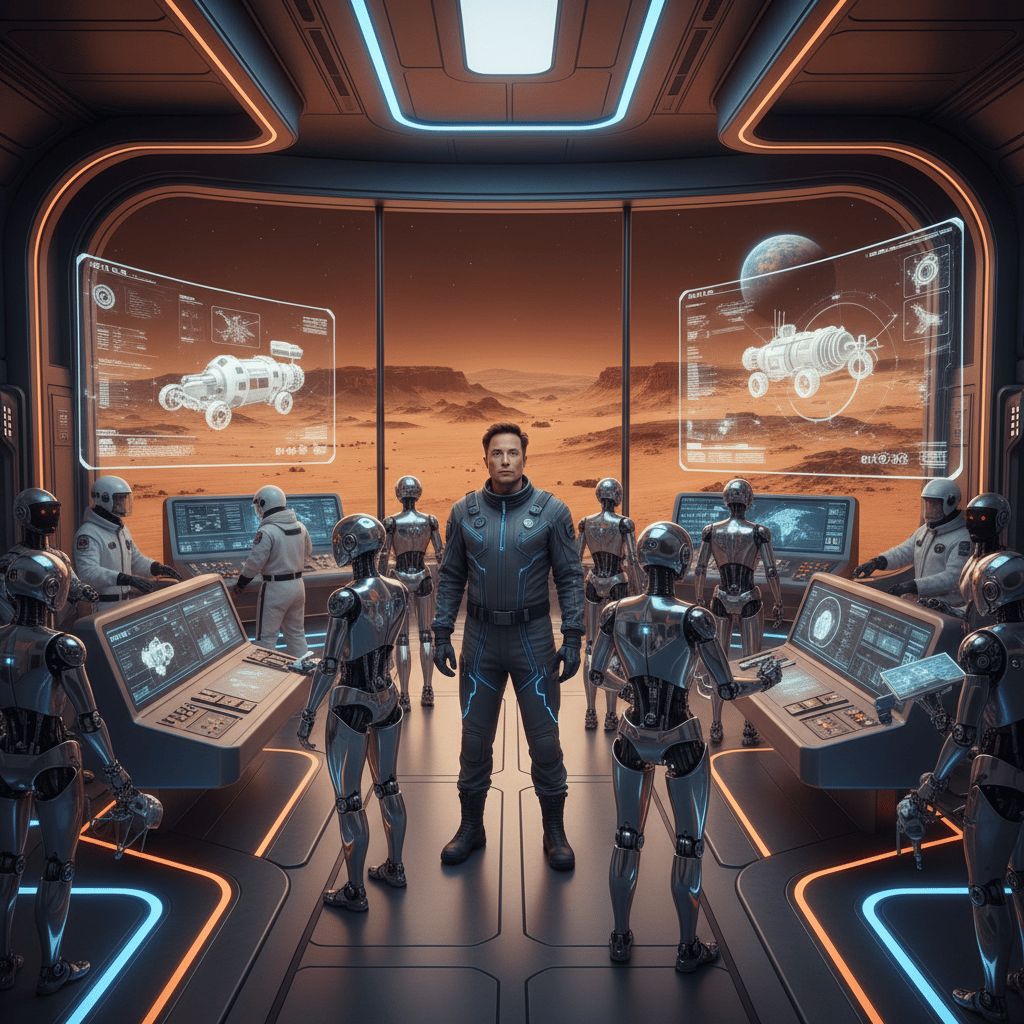 Prompt: Visualize Elon Musk standing in a cutting-edge Mars research facility surrounded by advanced AI robots and holographic blueprints. The lab features futuristic technology, glowing screens displaying Martian terrain data, and sleek metallic structures. Bright neon accents illuminate the space as AI assistants work alongside engineers. The Martian landscape is visible through massive glass windows, with Earth visible in the distant sky.