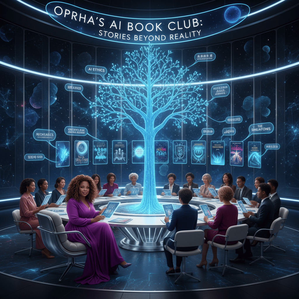 Image Prompt: "Oprah hosting an AI book club with diverse stories."