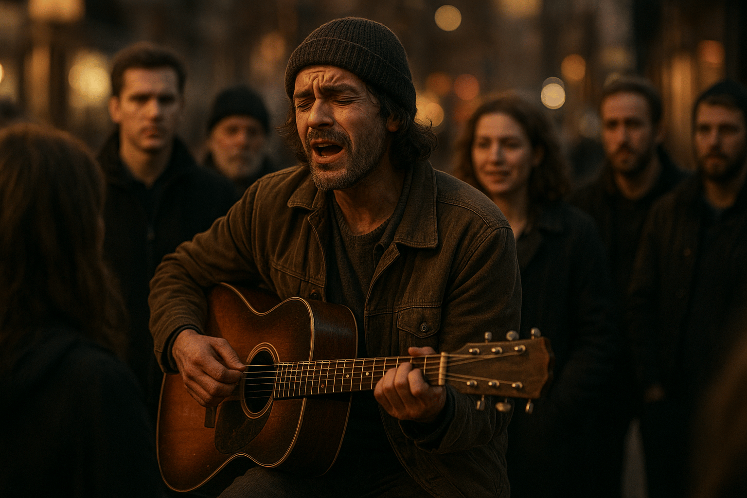 Prompt: An ultra-realistic, ultra-HD scene of a street musician performing for a small crowd. Capture expressive movement, natural facial reactions, and detailed textures on the instrument and clothing. Warm street lighting, soft shadows, and subtle urban background blur create a cinematic, documentary-style atmosphere.