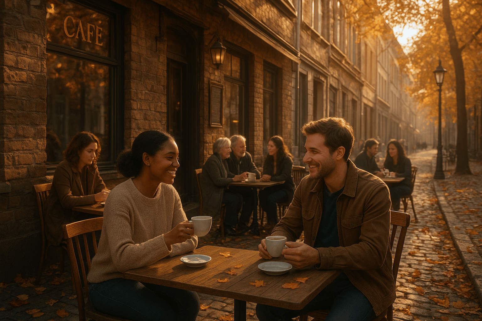 Prompt: A cozy European cafe street in autumn, golden sunlight casting long shadows on cobblestone streets, colorful fallen leaves gently drifting. People sitting at outdoor tables, drinking coffee, talking, smiling naturally; faces realistic, well-proportioned, diverse, with natural expressions. Detailed cafe exteriors, textured brick walls, wooden chairs, and steaming coffee cups. Soft sunlight reflecting on windows, cinematic depth of field, ultra-realistic lighting and textures, photorealistic, ultra HD 8K, warm and inviting atmosphere, natural human poses, no distorted faces, high detail on skin and clothing.
