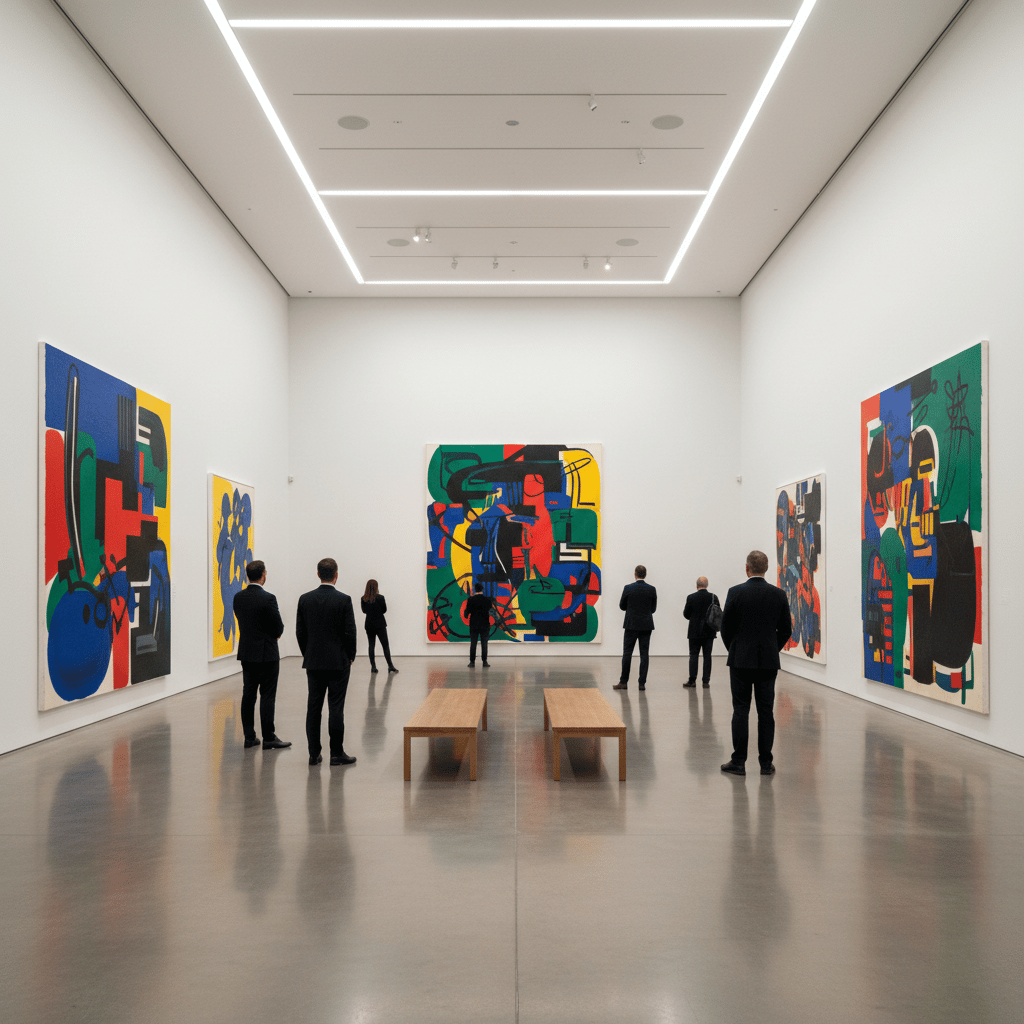 Prompt: A spacious contemporary art gallery with high white walls, large abstract paintings in bold colors, polished concrete floors reflecting soft overhead lighting, minimal wooden benches in the center, visitors quietly observing artwork, ultra-realistic photography style, sharp details, natural shadows, cinematic composition, 8K resolution.