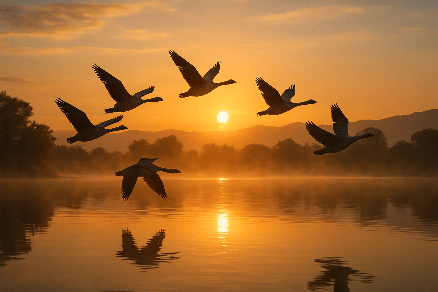 Prompt: An ultra-realistic scene of migrating birds flying in formation over a calm lake at sunrise. Warm golden sunlight spreads across the sky, creating soft reflections on the glassy water. Mist gently rises from the lake, adding depth and atmosphere. The birds’ wings show detailed textures and natural motion blur. Surrounding the lake are silhouettes of trees and distant mountains, faintly lit by the early morning glow. Shot in high resolution, with lifelike lighting, crisp details, natural colors, and a serene, cinematic mood.