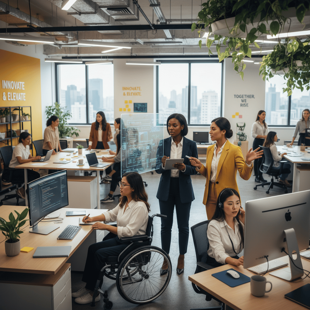Prompt: Create an inspiring image of diverse working women collaborating in a modern office. Highlight empowerment, teamwork, and innovation. Show women of different backgrounds engaged in leadership roles, fostering an inclusive and dynamic environment. Capture the essence of creativity and progress in the workplace.