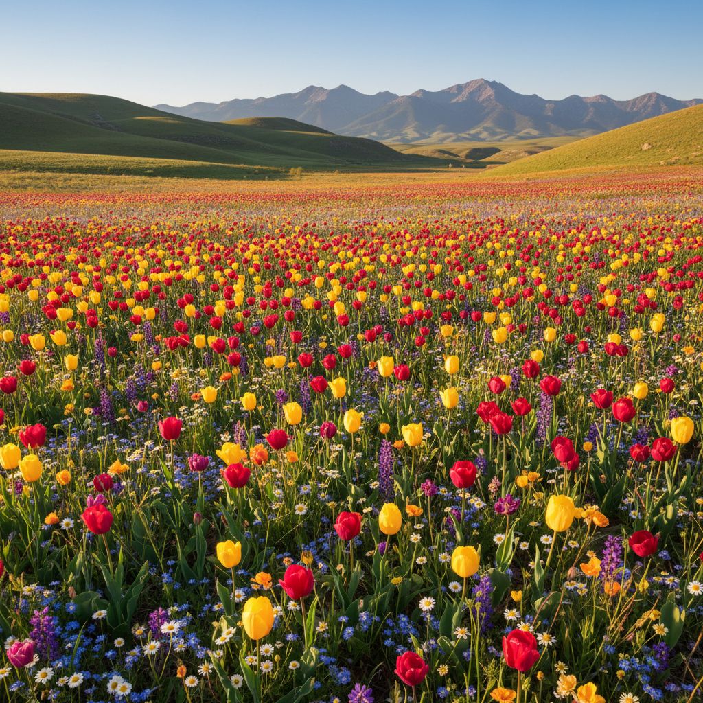 Prompt: Create an image of a breathtaking flower valley. The scene is filled with a sea of vibrant flowers, stretching as far as the eye can see. Various colors and types of flowers, such as tulips, daisies, and wildflowers, create a stunning tapestry. In the background, gentle hills or mountains rise under a clear, blue sky. Sunlight bathes the valley, enhancing the vivid colors and creating a warm, inviting atmosphere. A gentle breeze might be suggested by the slight sway of the flowers.