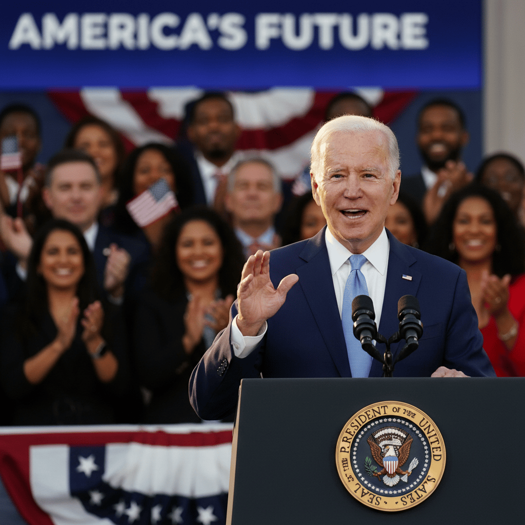 Prompt: Create an ultra-realistic, cinematic illustration of Joe Biden standing at a podium, speaking confidently to a friendly crowd.