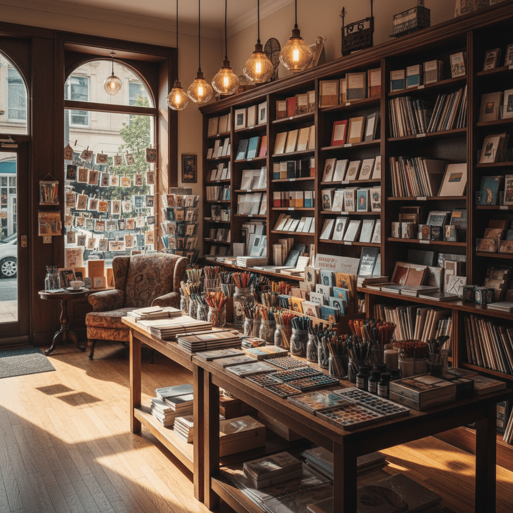 Prompt: A charming neighborhood stationery shop interior, wooden shelves filled with colorful notebooks, journals, pens, sketchbooks, greeting cards, soft warm lighting, sunlight entering through a glass window, neatly arranged art supplies on display tables, cozy atmosphere, ultra-realistic photography, high detail, natural shadows, 4K resolution.
