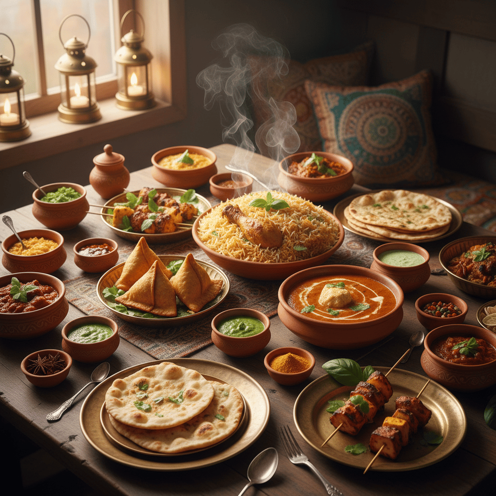 Prompt: Create a vibrant, high-detail scene showcasing a traditional Indian feast. Include dishes like biryani, butter chicken, samosas, paneer tikka, and naan on a beautifully set table. Add colorful spices, chutneys, and fresh herbs for extra richness. Include warm, inviting lighting and a slightly festive atmosphere with rustic Indian tableware. High-resolution, cinematic depth, and a slightly overhead perspective to capture all dishes.
