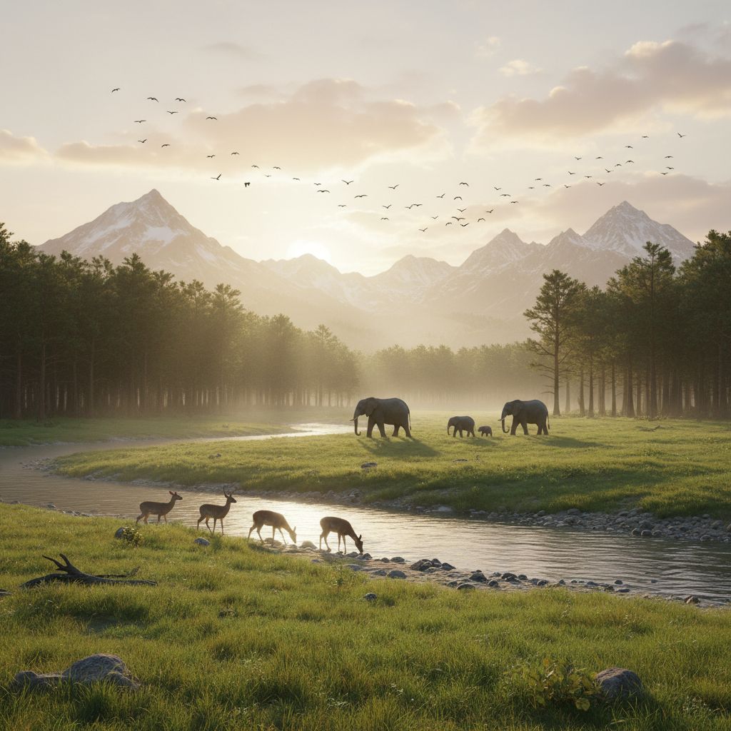 Prompt: A wide cinematic view of a peaceful wildlife country landscape, with rolling green meadows, dense forests, and distant mountains under a soft golden sky. Deer graze near a riverbank, elephants move slowly across open land, birds fly in loose formations, and sunlight filters through trees. The scene feels untouched, natural, and balanced, with rich textures, realistic lighting, and a calm, documentary-style atmosphere. Ultra-detailed, photorealistic, high resolution.