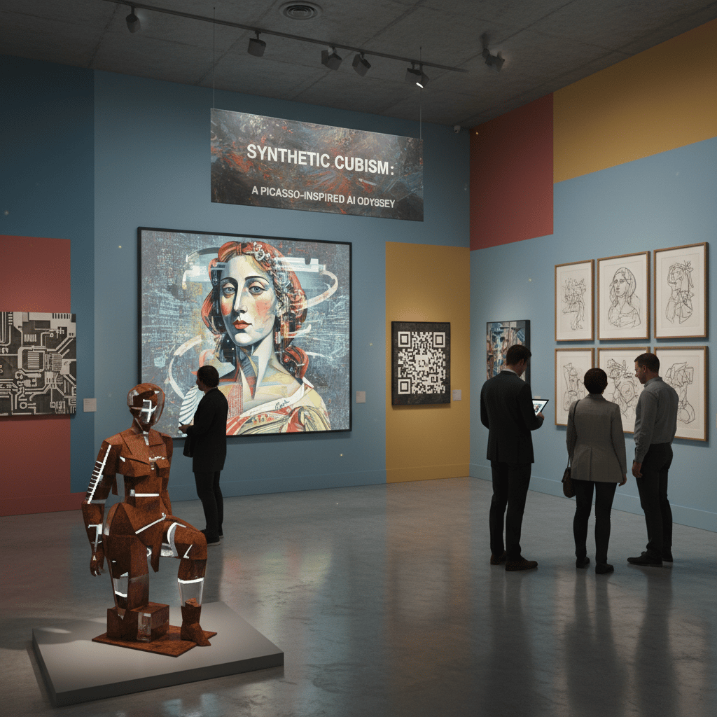 Image Prompt: "AI art exhibition inspired by Picasso, blending traditional and digital techniques."