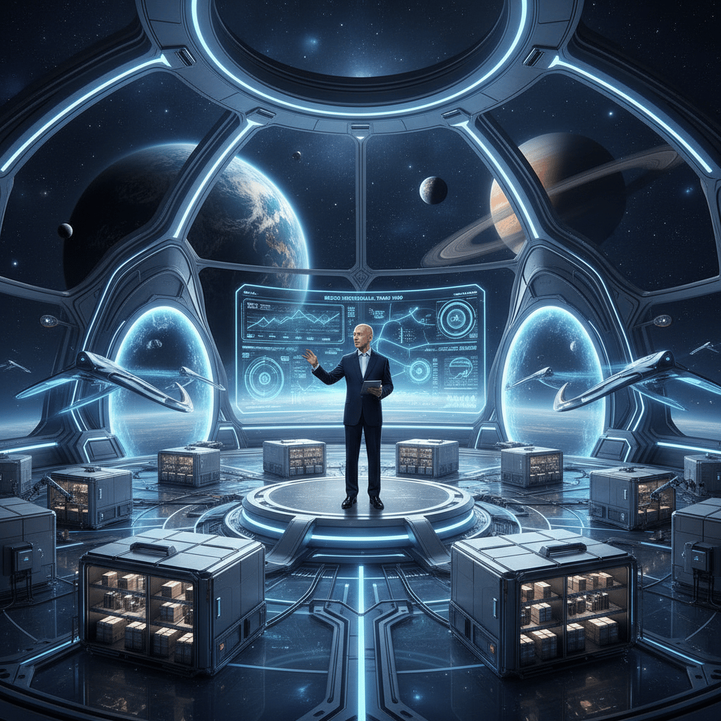 Prompt: Depict a futuristic space station where Jeff Bezos oversees intergalactic commerce. The hub features AI-managed warehouses floating in zero gravity, autonomous drones transporting packages between planets, and holographic trade screens. Earth and multiple planets are visible through transparent domes. Advanced technology and sleek design dominate the environment, with blue and silver color schemes.