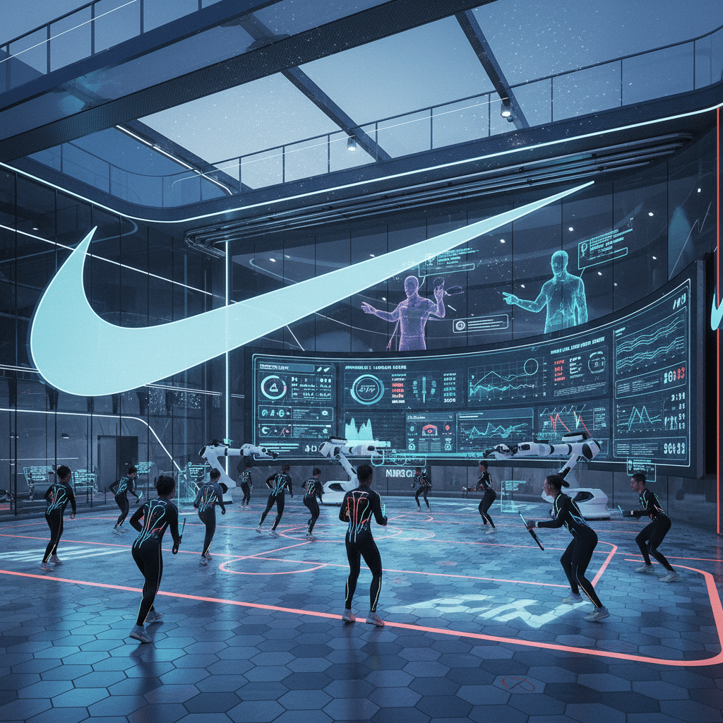 Prompt: Design a state-of-the-art Nike sports facility where AI analyzes athletic performance in real-time. Athletes wear smart gear that glows with biometric data, while holographic coaches provide instant feedback. The center features a sleek design with Nike's iconic swoosh integrated into futuristic architecture. Massive displays show performance metrics, and AI robots assist in training regimens. Energy and innovation fill the space.
