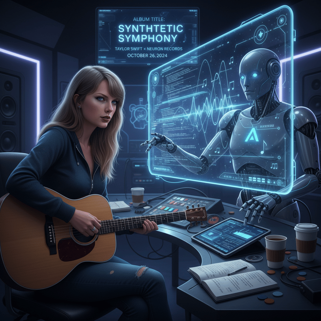 Image Prompt: "Taylor Swift collaborating with AI to create a hit album."