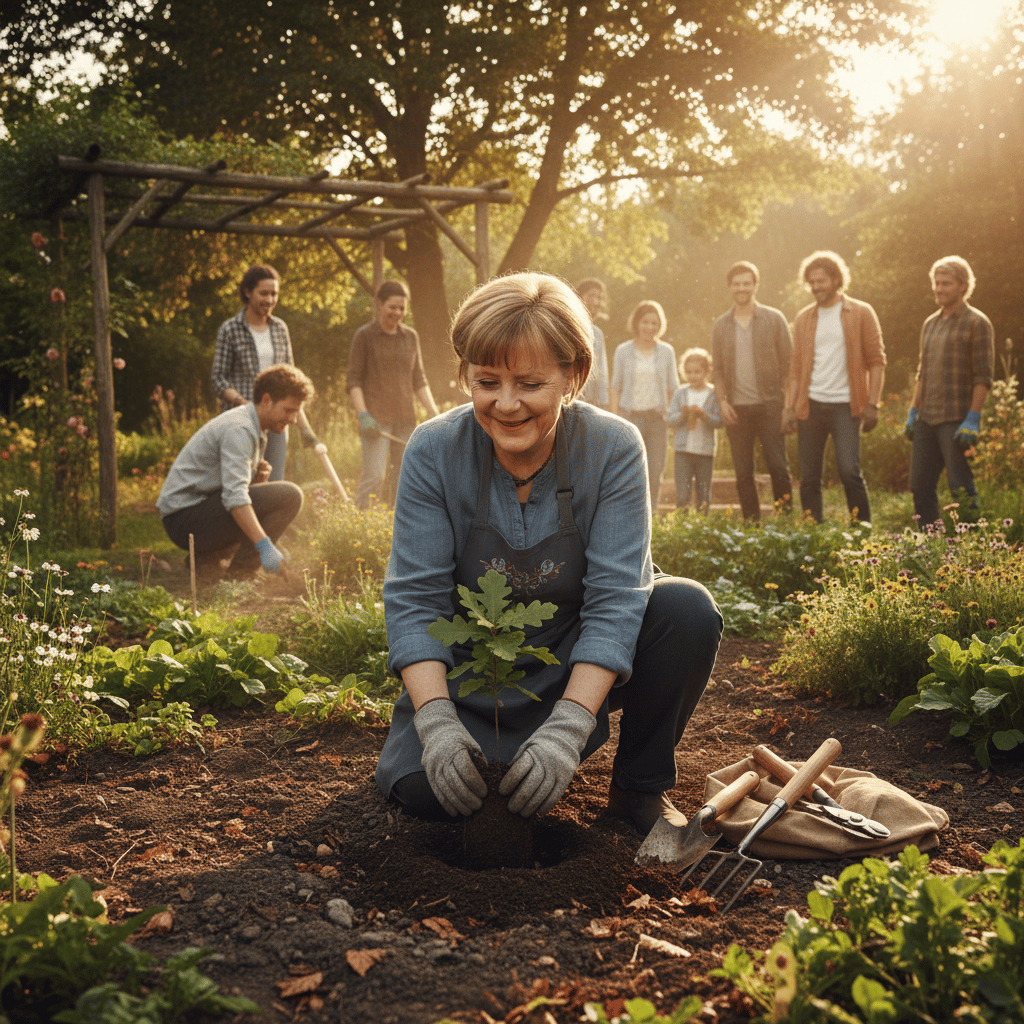 Prompt: Ultra-realistic cinematic image of Angela Merkel planting a tree in a community garden at golden hour. Realistic sunlight streaming through surrounding trees, detailed textures on soil, leaves, and gardening tools. Merkel is wearing casual yet elegant clothing, natural facial expression, soft cinematic depth of field, warm and inviting color grading, realistic shadows, slight lens flare, ultra-HD resolution, photographically authentic scene capturing empathy and leadership.