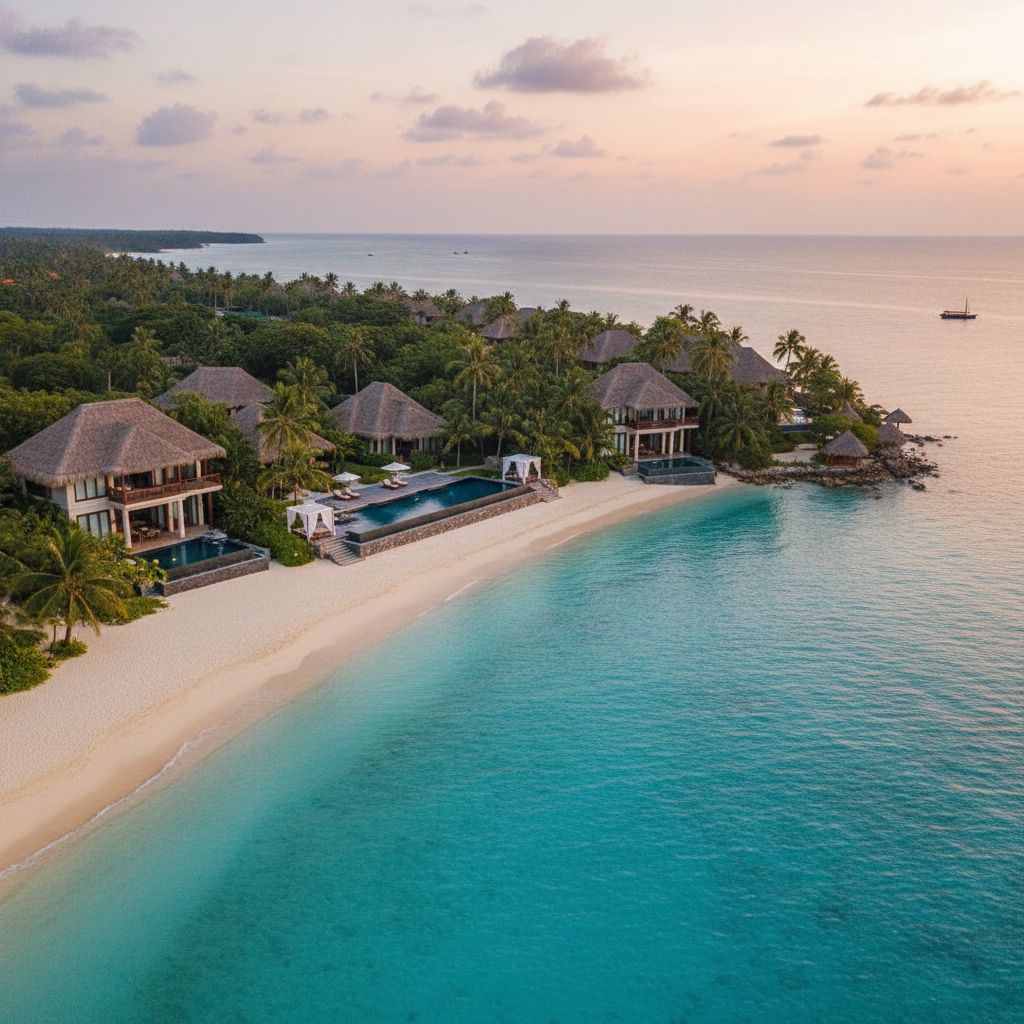 Prompt: Create an image of a luxurious beachfront resort. Highlight the serene beauty of the ocean, with clear blue waters and white sandy beaches. Include elegant bungalows or villas with thatched roofs, lush tropical gardens, and a stunning infinity pool overlooking the sea. Capture the essence of relaxation and paradise.